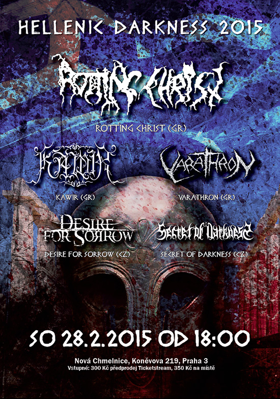 Helénská temnota se začne šířit v pražském klubu Nová Chmelnice v sobotu 28. února 2015. Vstupné na místě bude činit 350 Kč, v předprodeji v síti Ticketstream je za 300 Kč. Předprodej také běží na e-shopu Metalgate. Brány klubu se otevřou v 18:30, první apoštol temnot vystoupí úderem sedmé hodiny. Těšíme se na vás!